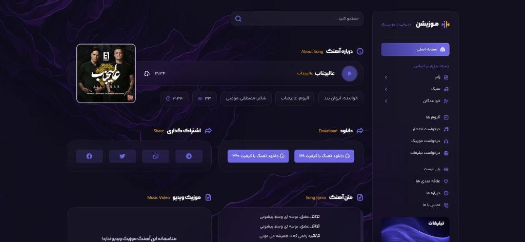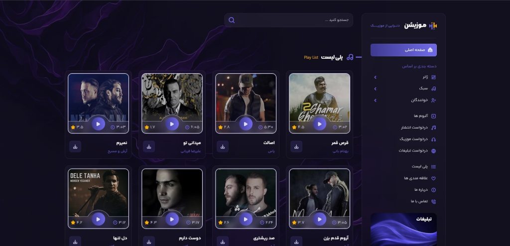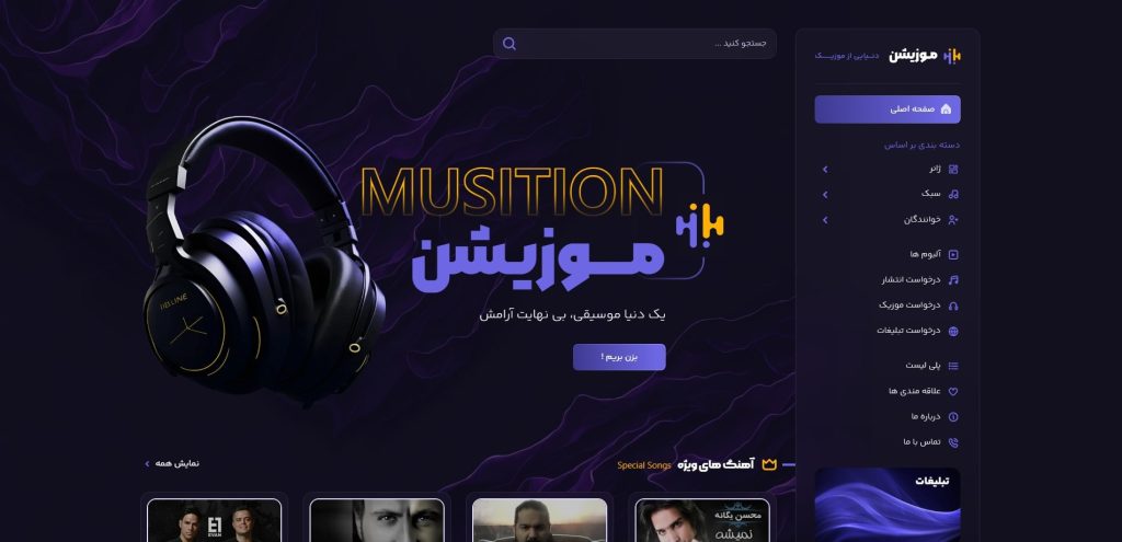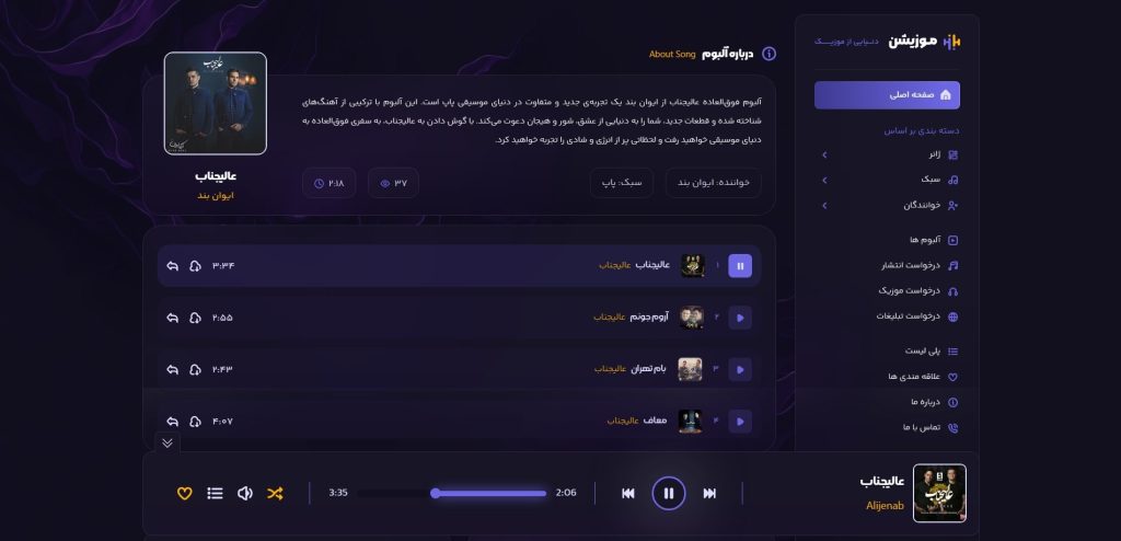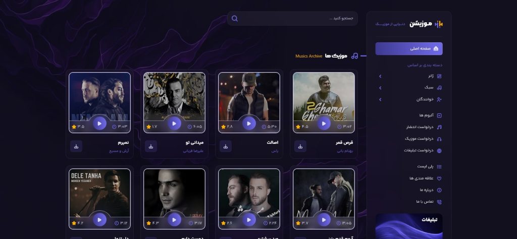 - طراحی UI/UX اختصاصی: استفاده از تم Dark Mode جهت کاهش خستگی چشم و افزایش جذابیت بصری متناسب با فضای موسیقی.